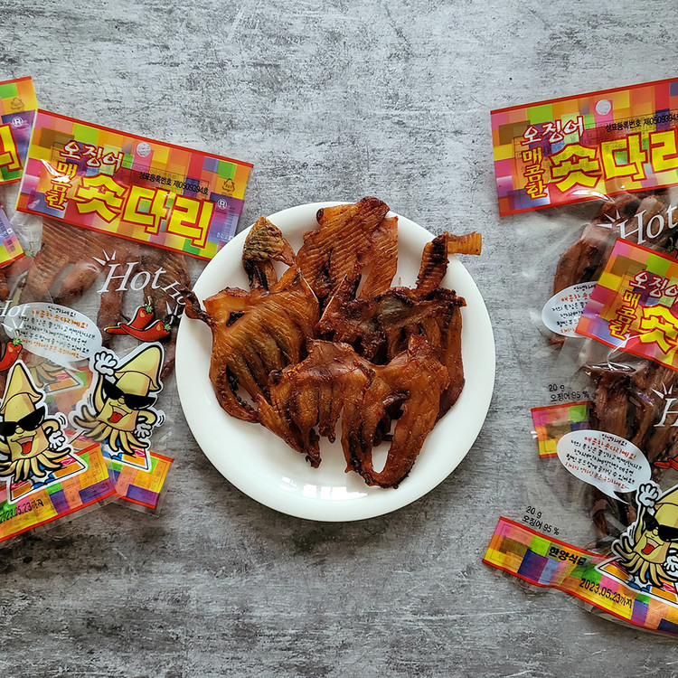 PC방,편의점,휴게소에서 즐겨먹었던 추억의 과자 오징어 숏다리에요. 입이 심심할 때 간편하게 뜯고 바로 즐길 수 있는 주전부리로 극장에서 영화볼 때도 좋고 야외에 캠핑이나 여행, 나들이 나갈 때도 챙겨나가면 좋은 효자 아이템이랍니다!
