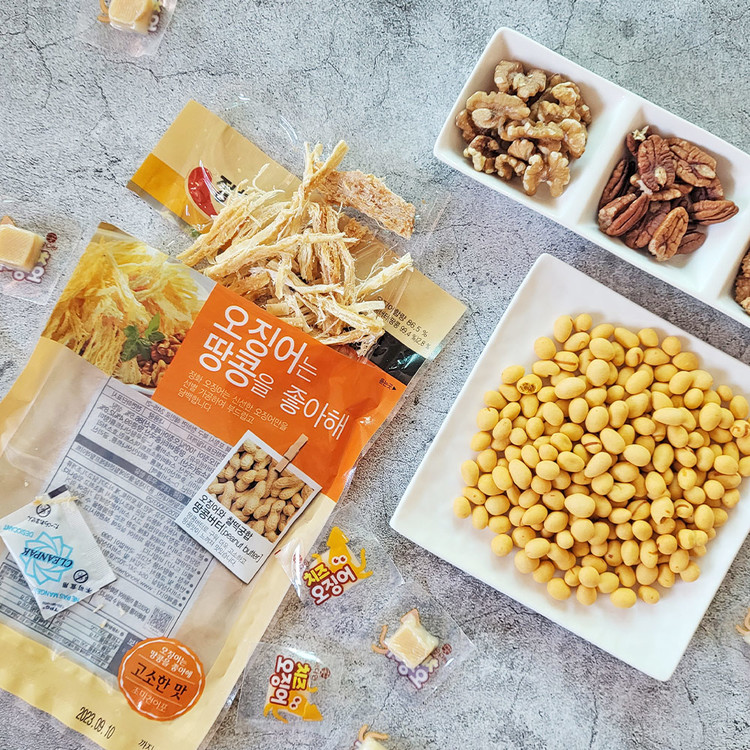 조미오징어100%[오징어(페루산)86.5%,설탕,가공버터(우유),땅콩버터(중국산,땅콩99.4%)2.8%,정제소금(국산),D-소비톨,L-글루탐산나트륨(향미증진제),구연산,스테비텐소프트(덱스트린,효소처리스테비아),호박산이나트륨,메타인산나트륨,글리신,DL-알라닌,D-소비톨액]