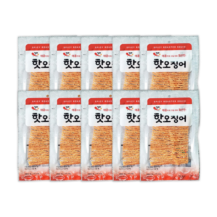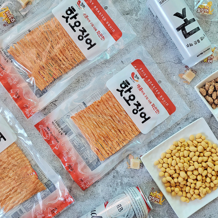 오징어(외국산:페루,칠레,중국 등)90.17%,설탕,정제소금(국산),홍고추분말,D-소비톨,L-글루탐산나트륨(향미증진제),구연산,글리신,DL-알라닌,메타인산나트륨,소브산칼륨(합성보존료),호박산이나트륨,매운맛소스(대두유)1.5%,빙초산 * 오징어,대두,우유 함유