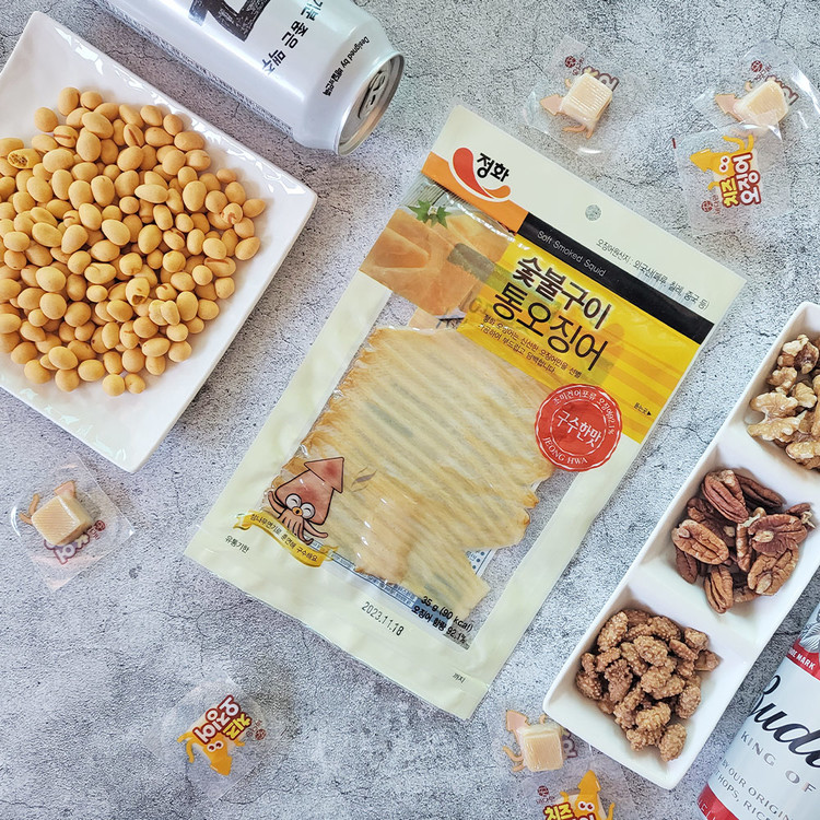 조미오징어100%[오징어(외국산:페루,칠레,중국 등)92.1%,설탕,D-소비톨,정제소금(국산),L-글루탐산나트륨(향미증진제),스테비텐소프트(덱스트린,효소처리스테비아),구연산,호박산이나트륨,글리신,DL-알라닌,메타인산나트륨,D-소비톨액] * 오징어 함유
